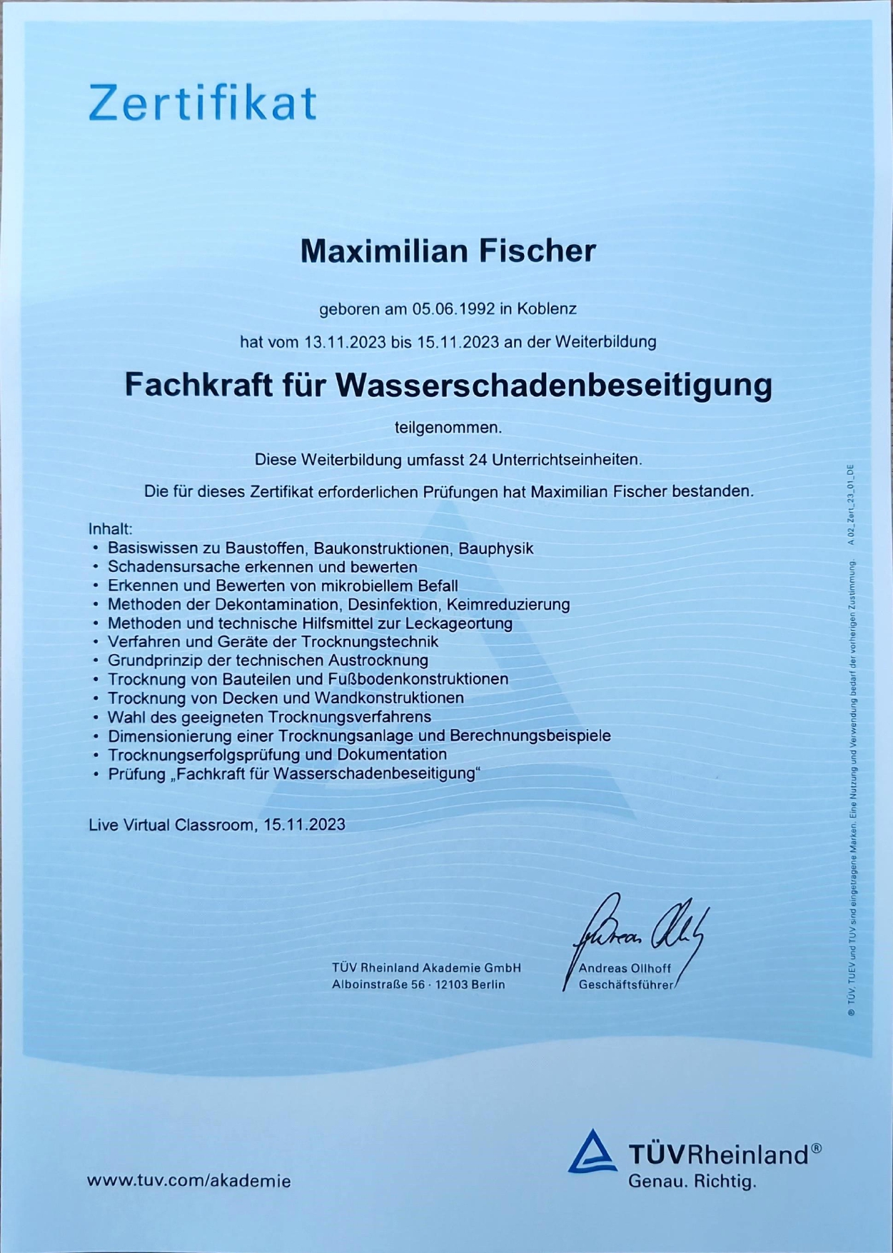 Dank unseres TÜV-Zertifikats dürfen wir uns offiziell als „Fachkraft für Wasserschadenbeseitigung“ bezeichnen und sind in dieser Eigenschaft anerkannt. Vertrauen Sie auf unsere langjährige Erfahrung und das fundierte Fachwissen, das durch viele erfolgreich durchgeführte Trocknungen entstanden ist.