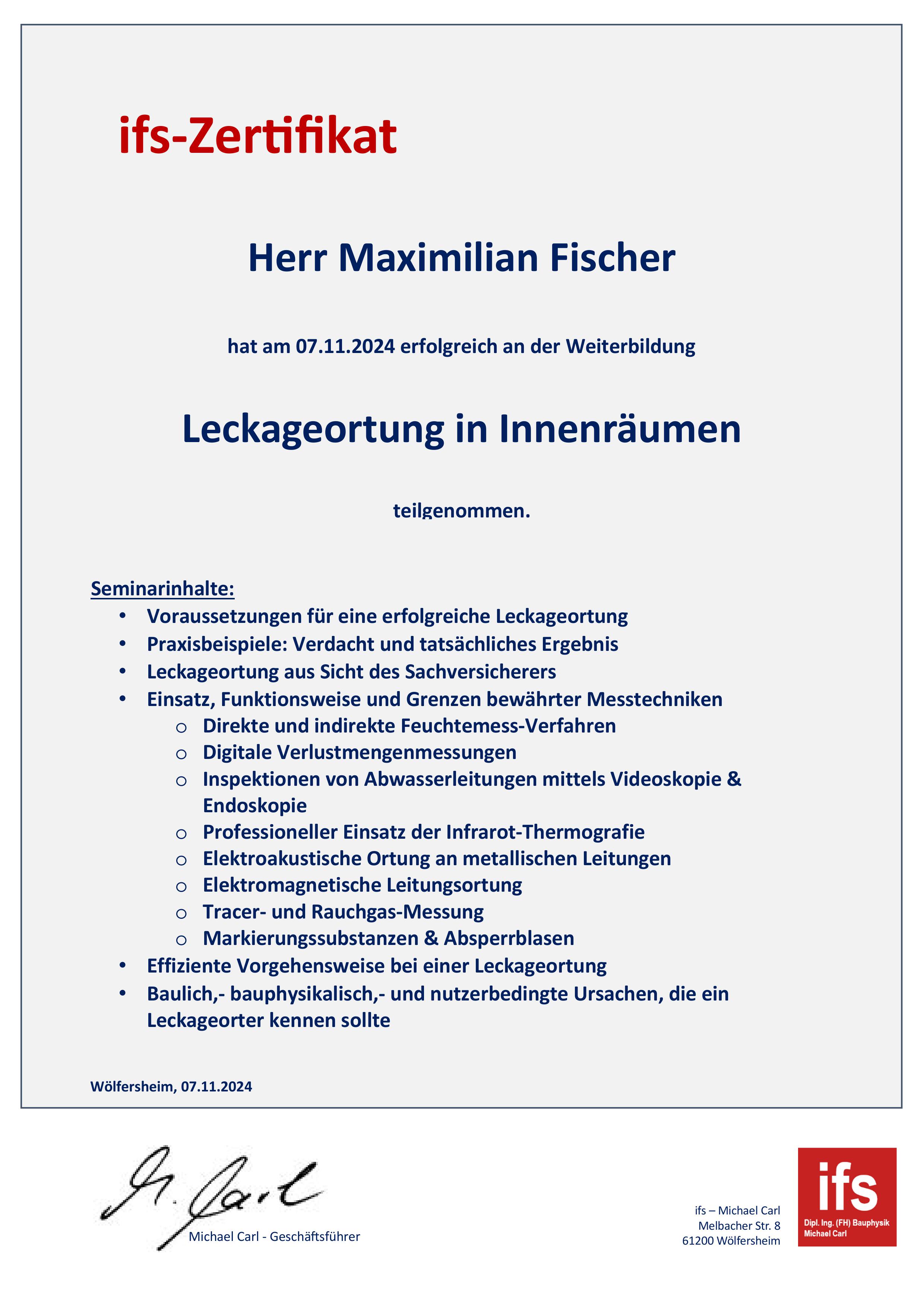 Darüber hinaus haben wir in unserer umfassenden Fortbildung nicht nur Basiswissen über Baustoffe, Baukonstruktionen und Bauphysik erworben, sondern auch Schwerpunkte auf die Identifizierung und Bewertung von Schadensursachen, insbesondere mikrobiellem Befall, gelegt. Unsere vertieften Kenntnisse erstrecken sich über verschiedene Bereiche, darunter: